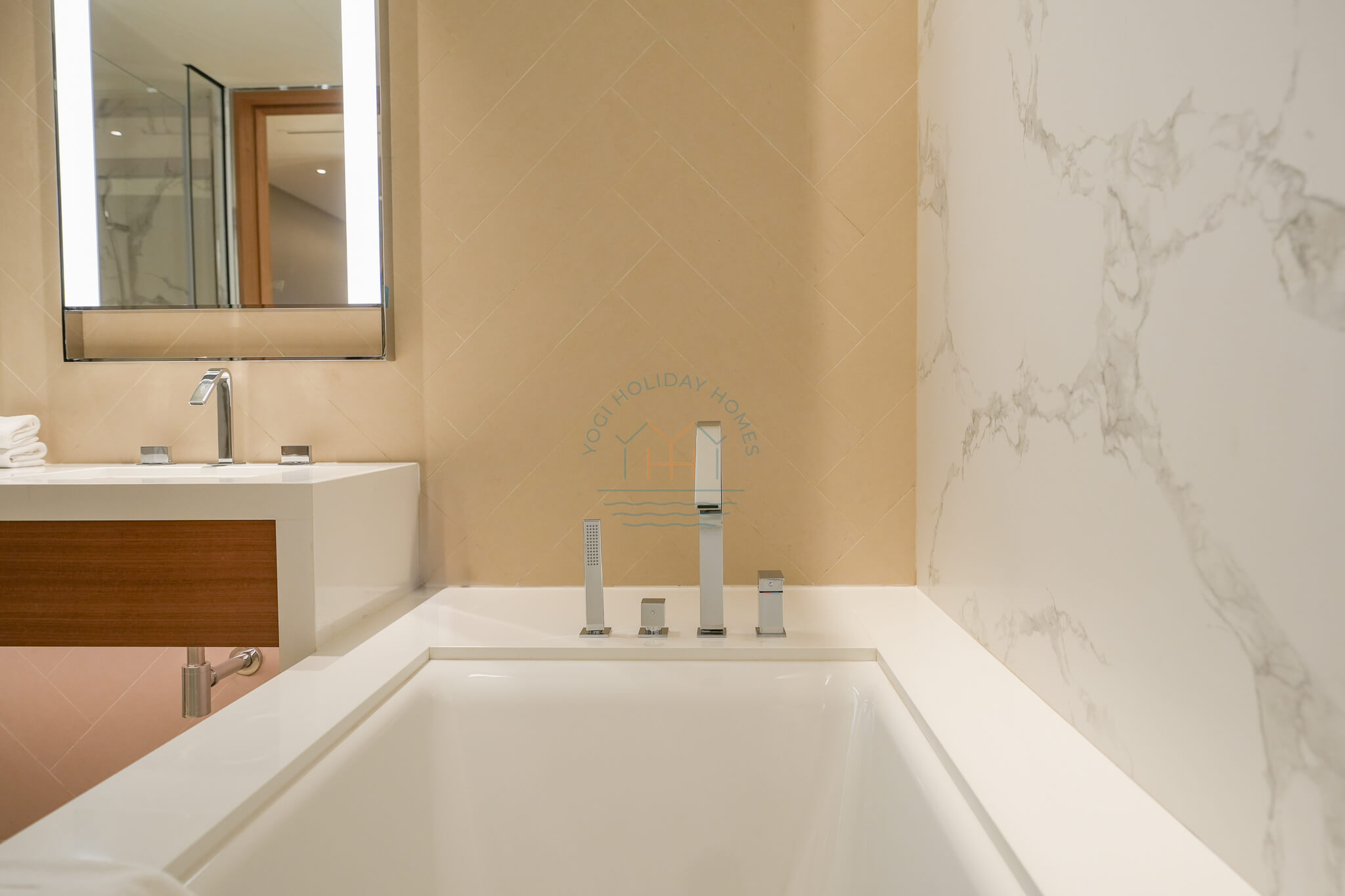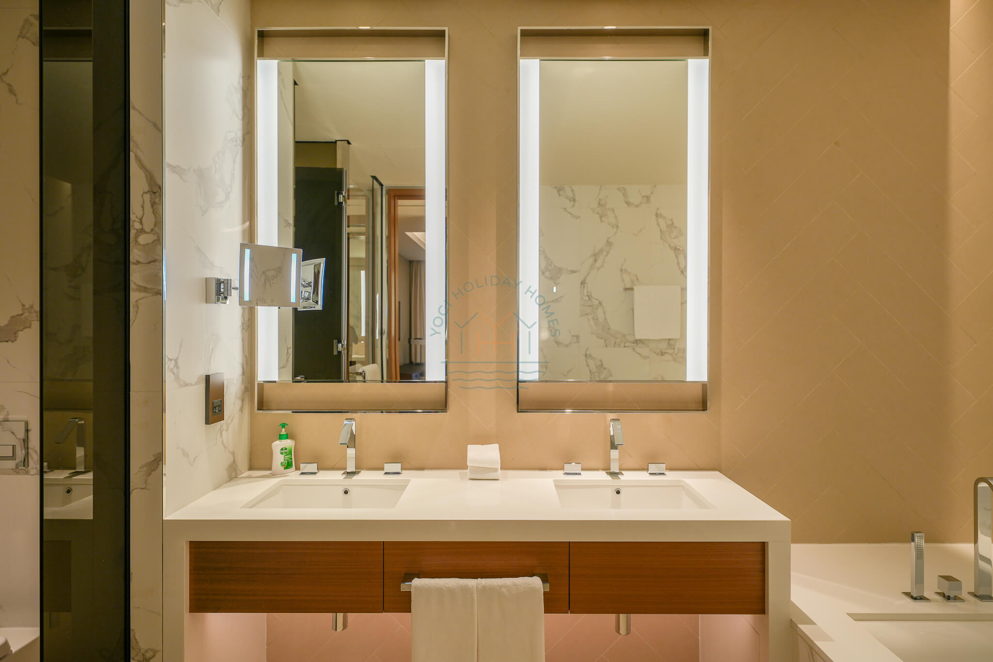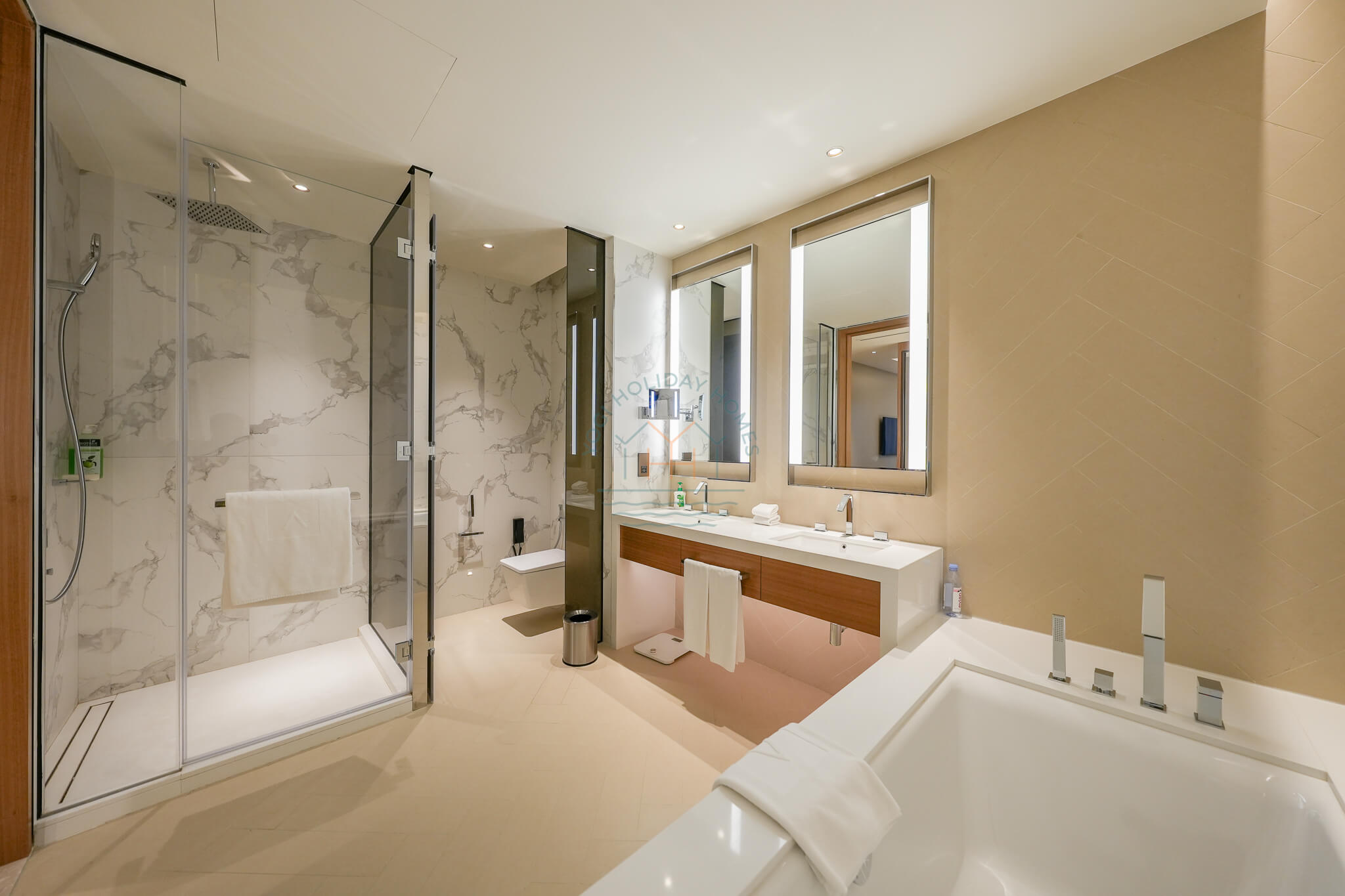The apartment includes three elegantly designed bathrooms. The master ensuite boasts a bathtub, shower, and his-and-her sinks, while the additional bathrooms feature modern fittings, luxurious showers, and high-end toiletries.