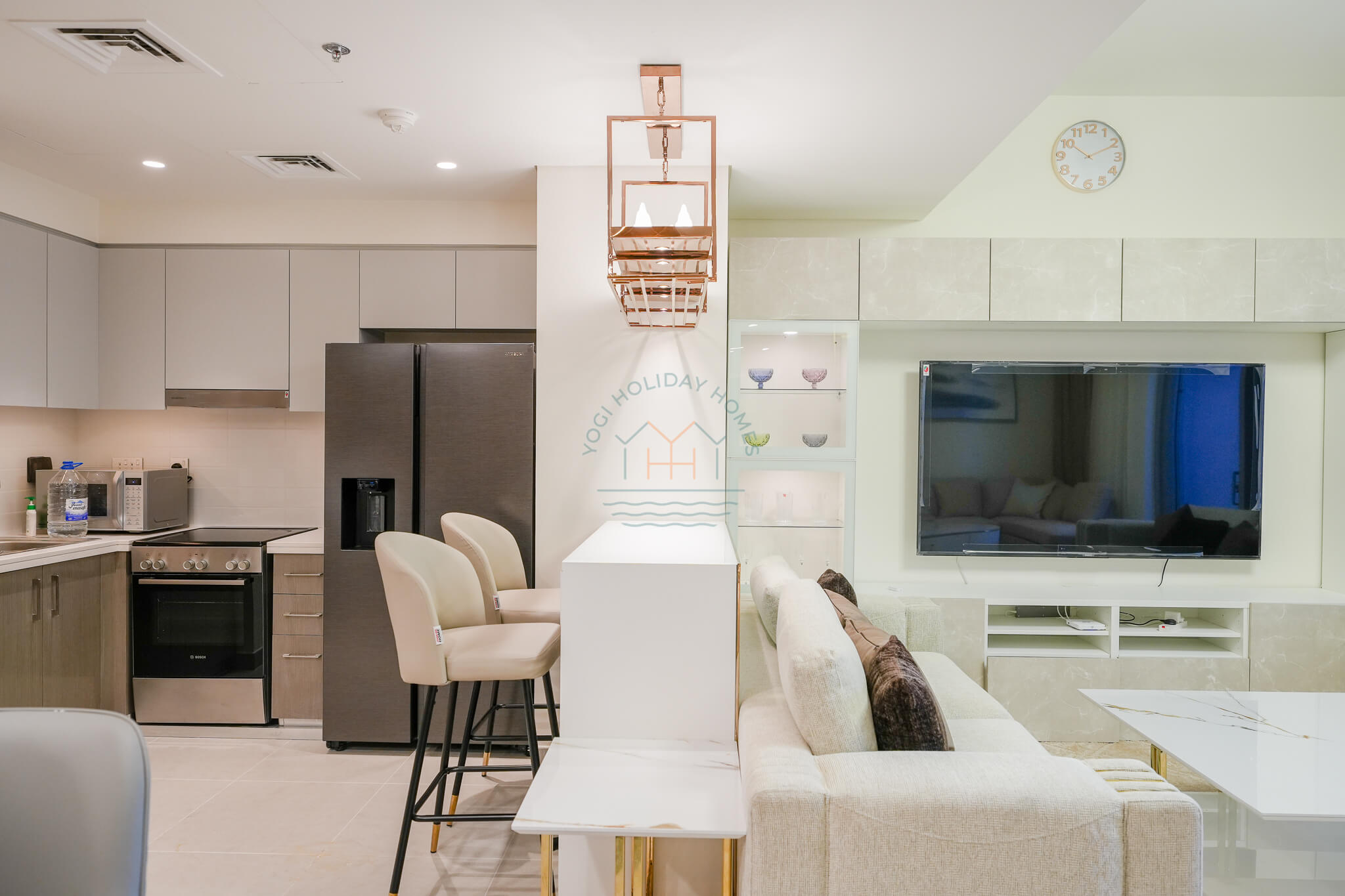 - Fully-Equipped Kitchen: Double-door refrigerator, gas stove, oven, microwave, dishwasher, freezer, and cooking essentials.